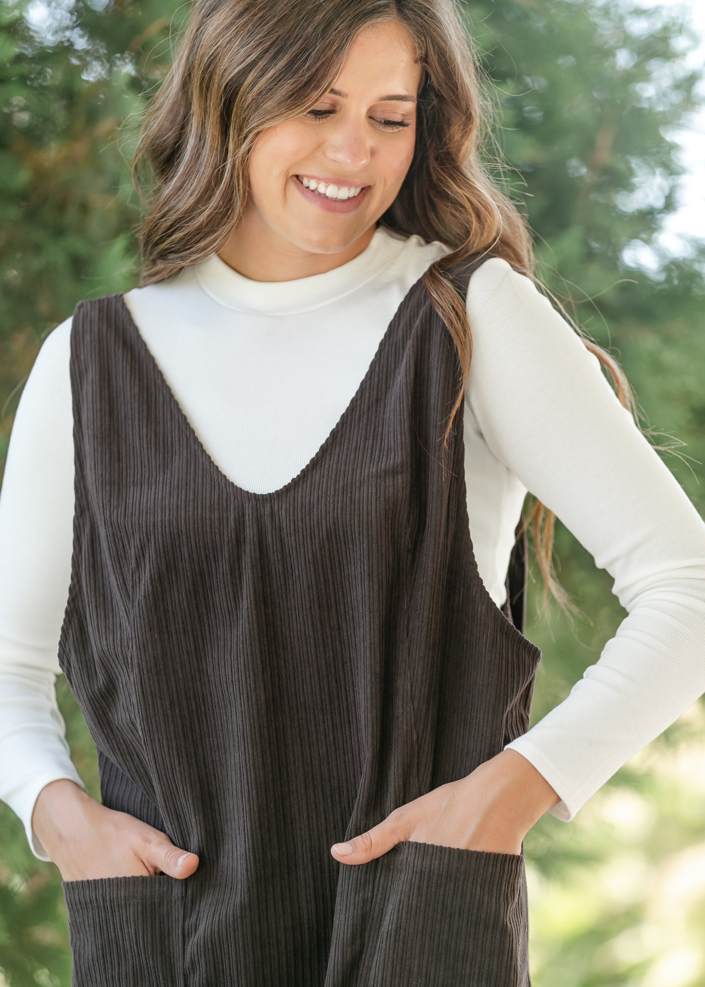 The Chocolate Corduroy Overall Dress is designed in a rich, textured corduroy with a relaxed silhouette that layers beautifully over fitted tops. Featuring a flattering V-neckline, wide adjustable straps with metal rings, and roomy front patch pockets, it blends practicality with style. The midi length makes it easy to wear with boots, flats, or sneakers, creating a versatile piece for every season.