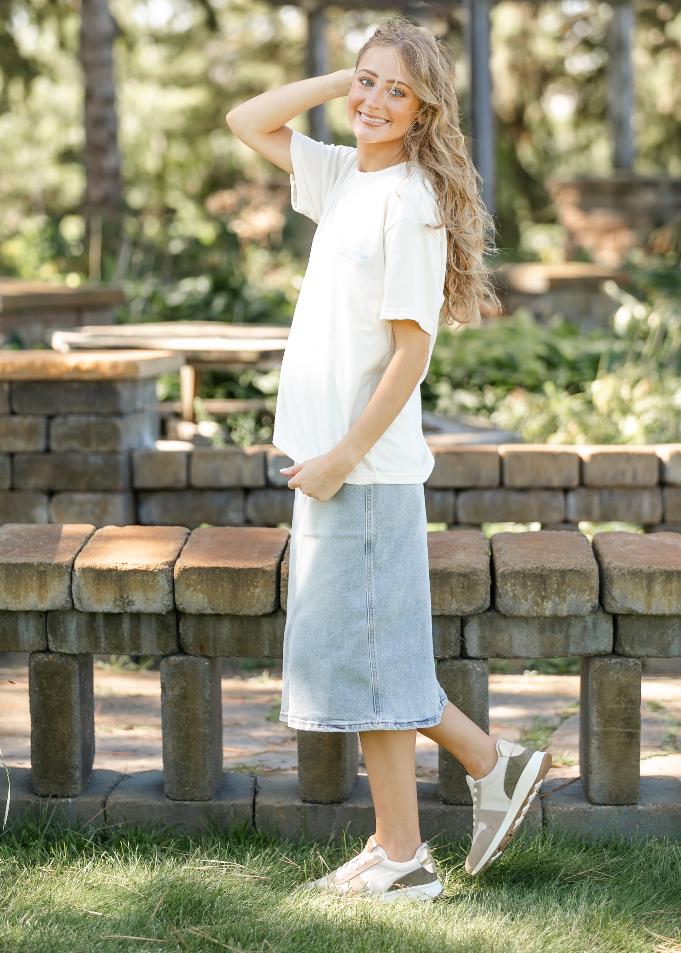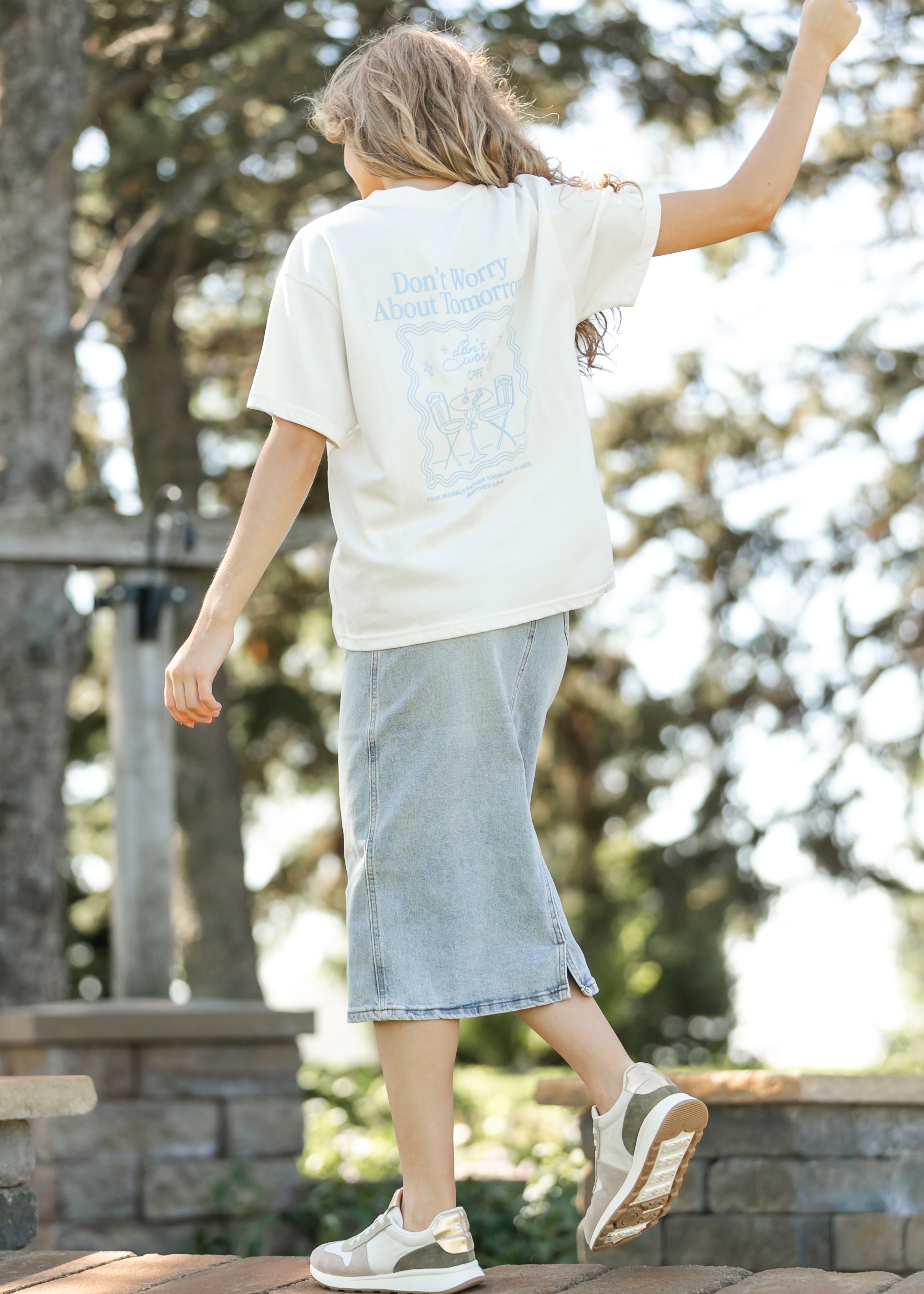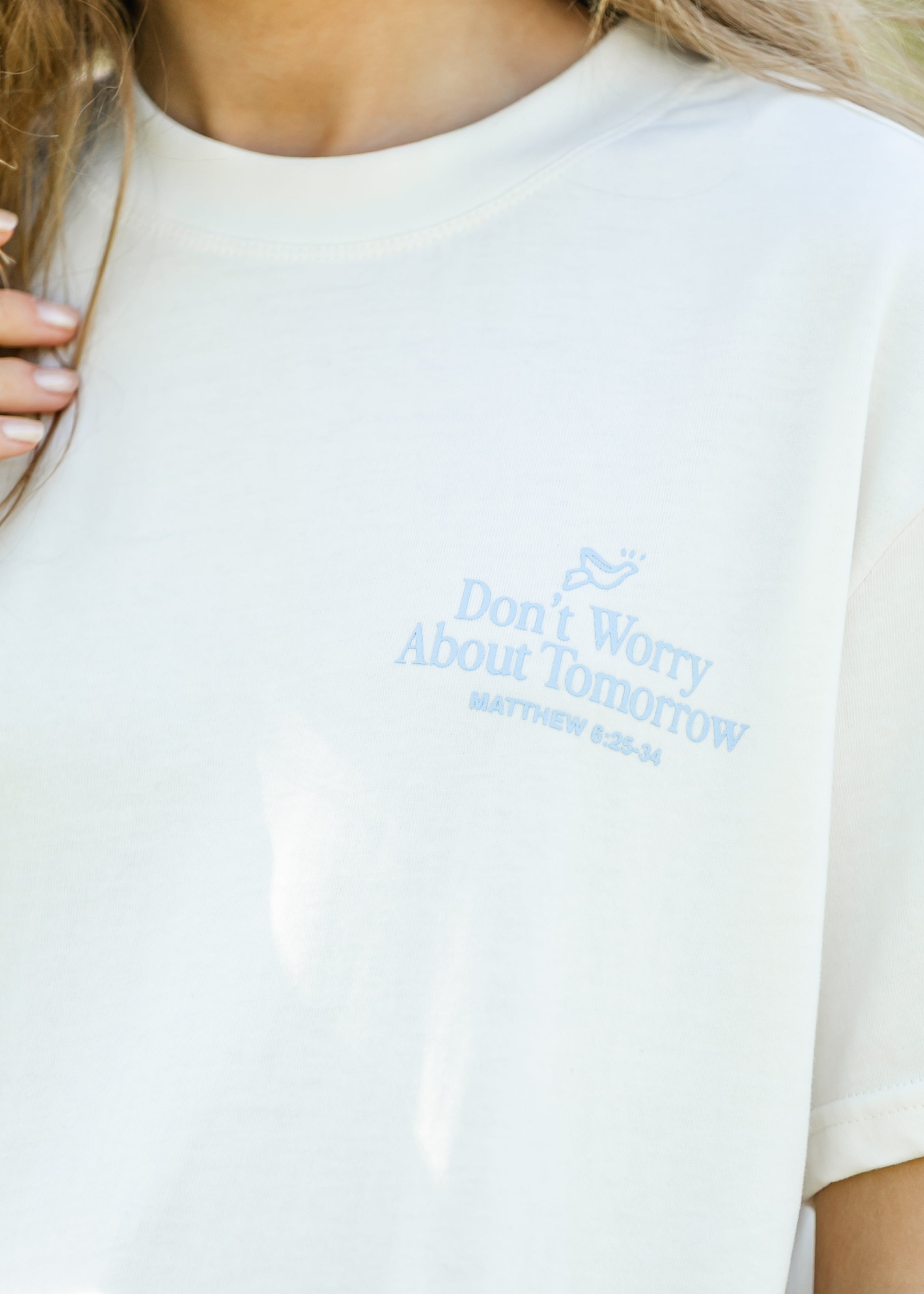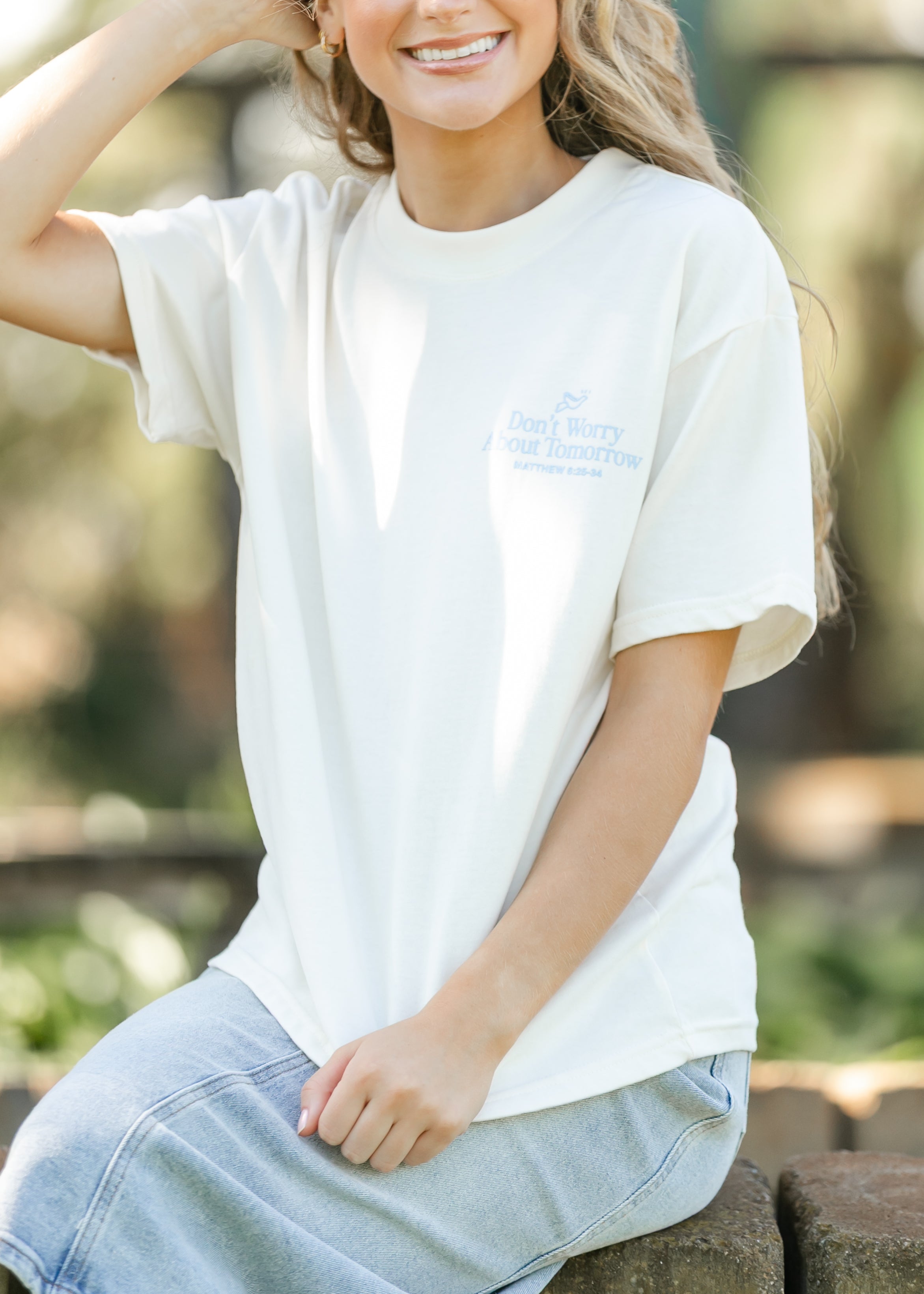 The Don’t Worry Cafe Graphic T-shirt is a soft, laid-back tee with a hopeful message drawn from Matthew 6:25–34. Featuring a relaxed fit and sky-blue lettering, it carries both comfort and encouragement for everyday wear. Pair it with flowy skirts for a gentle, feminine look or with denim for an easy, timeless style that speaks faith and ease.