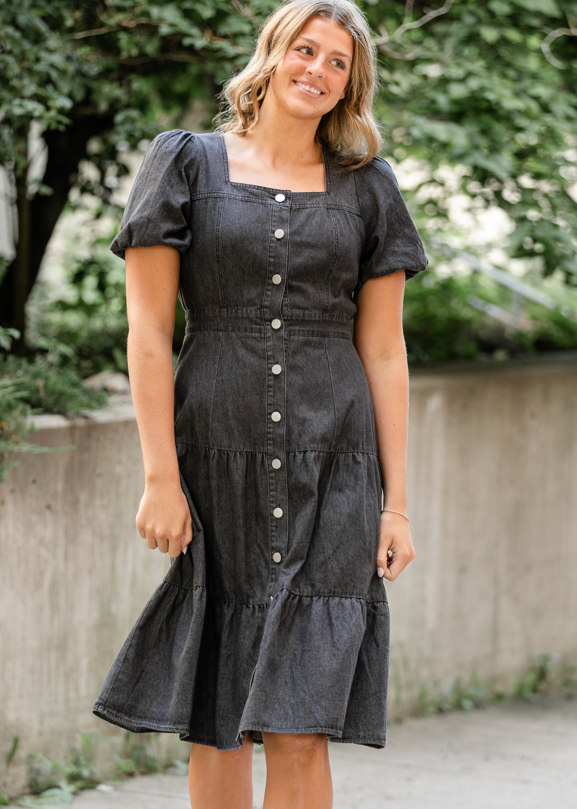 The Elton Square Neck Dress blends structure with softness, featuring a flattering square neckline, button-front detail, and subtle puff sleeves. Crafted in washed black denim with a tiered skirt, it’s a piece that balances everyday ease with timeless style. Perfect for pairing with sandals on warm afternoons or layering with a cardigan and boots as the season cools.
