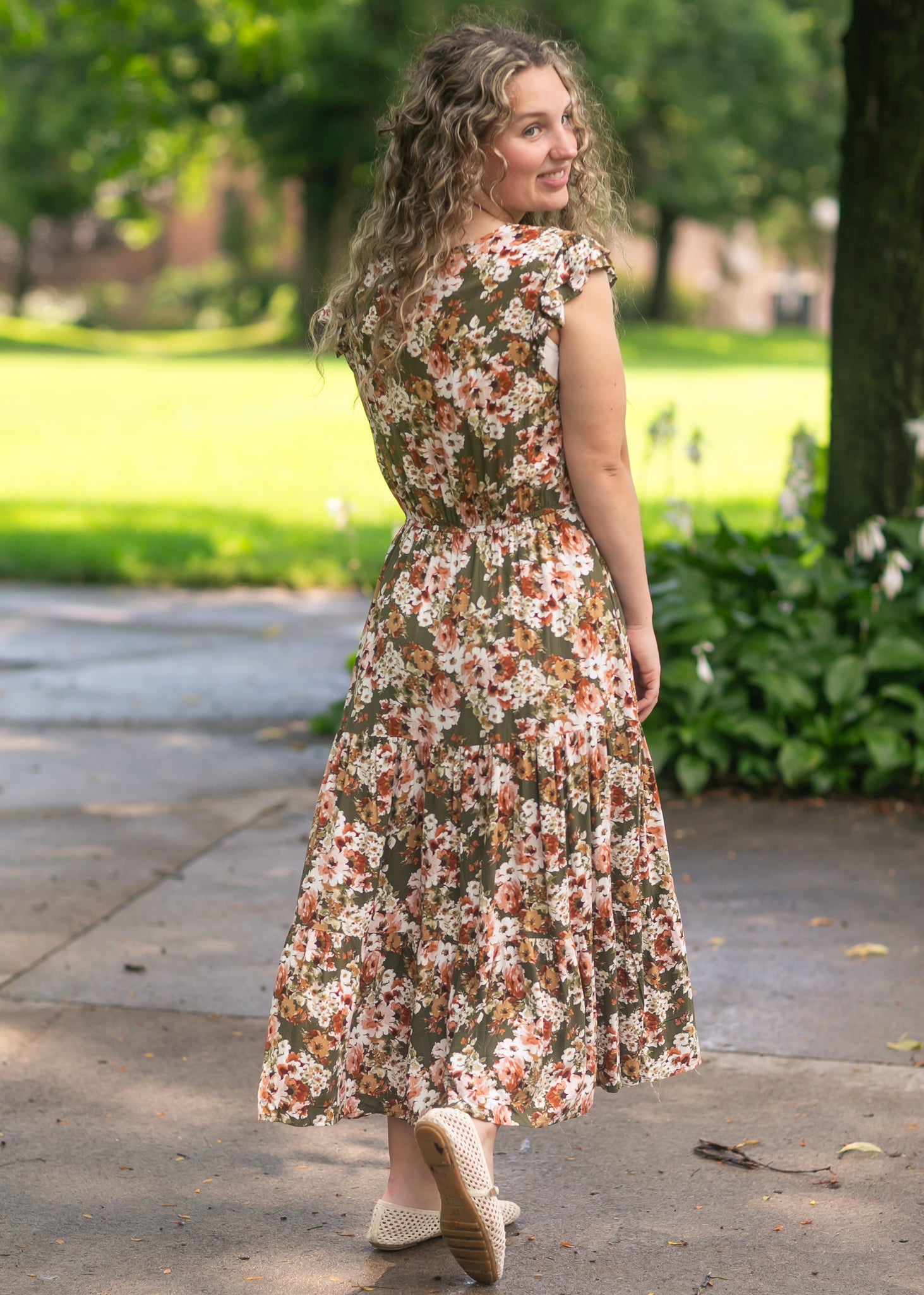 The Floral Smocked V-Neck Dress brings effortless femininity with its soft smocked bodice, tiered skirt, and flutter sleeves. Designed in earthy olive tones with warm floral blooms, this dress flows beautifully for Sunday gatherings, outdoor strolls, or afternoon brunch. Pair with simple flats for an easy day look or layer with a denim jacket for timeless modest styling.