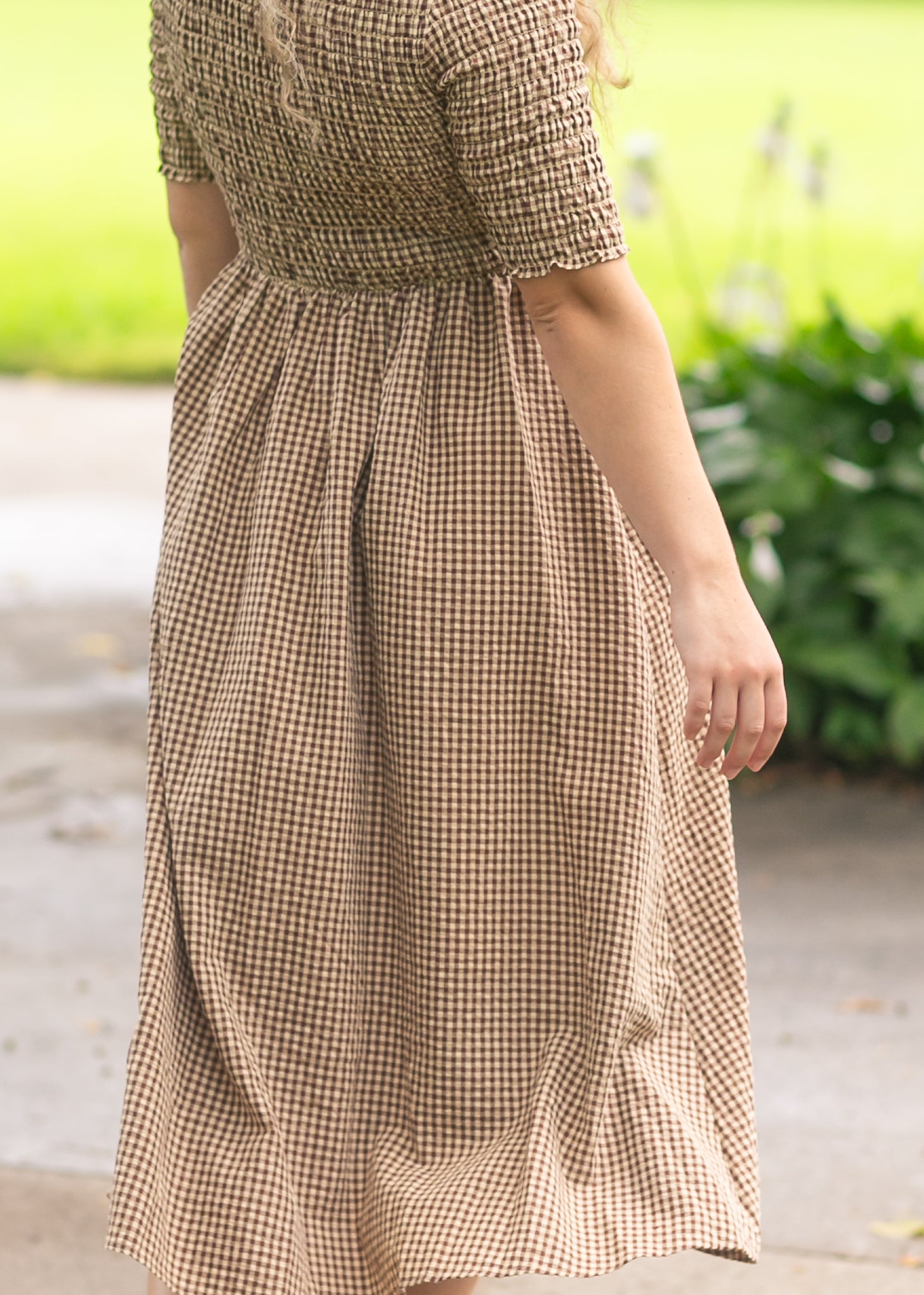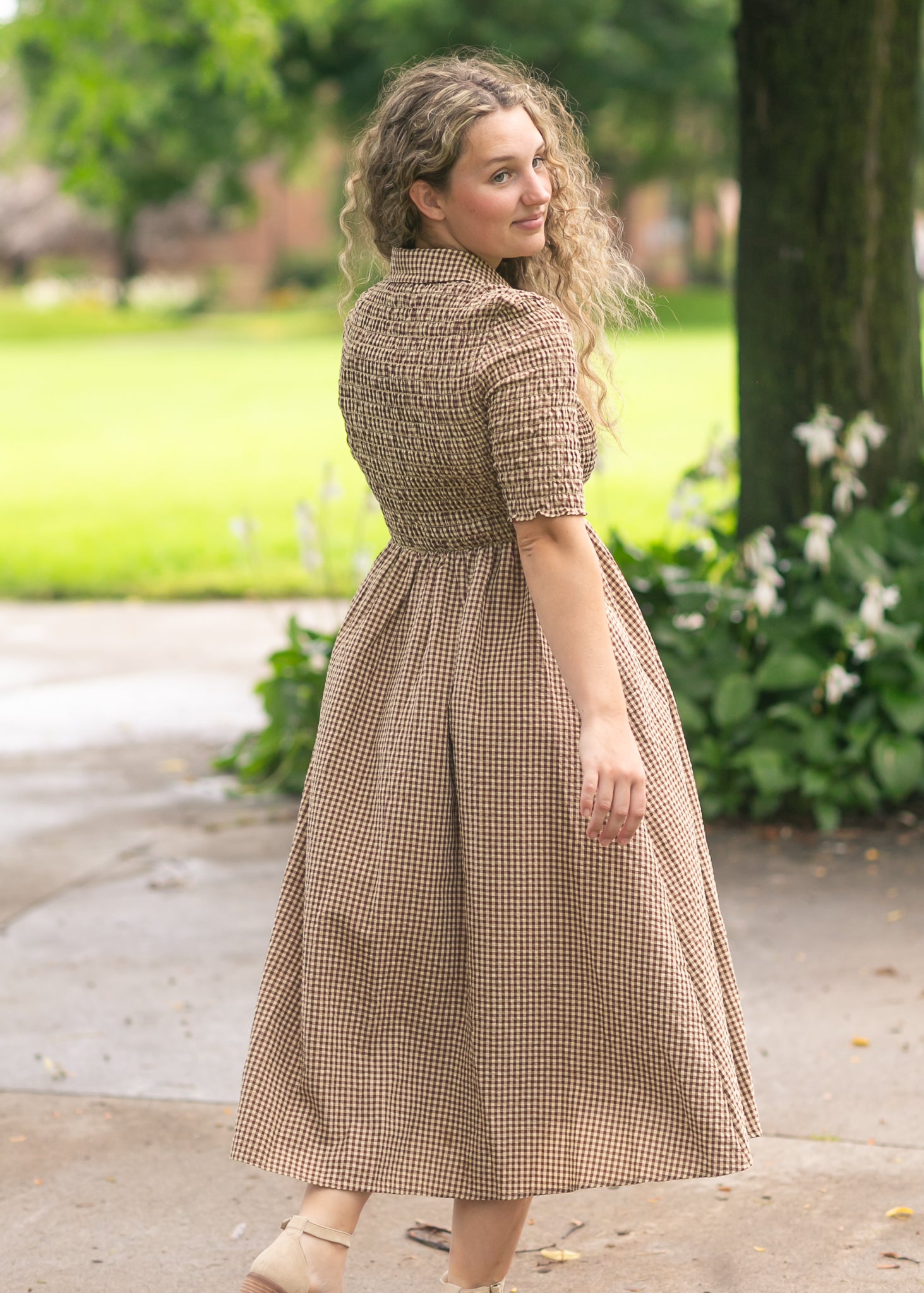 The Gingham Button Up Midi Dress blends nostalgic charm with everyday ease. A smocked bodice and collared neckline give structure, while the flowing skirt offers a graceful silhouette. Short sleeves and a button front add timeless detail, making it an effortless piece to wear with sandals in warm weather or layered under a cardigan for transitional days.