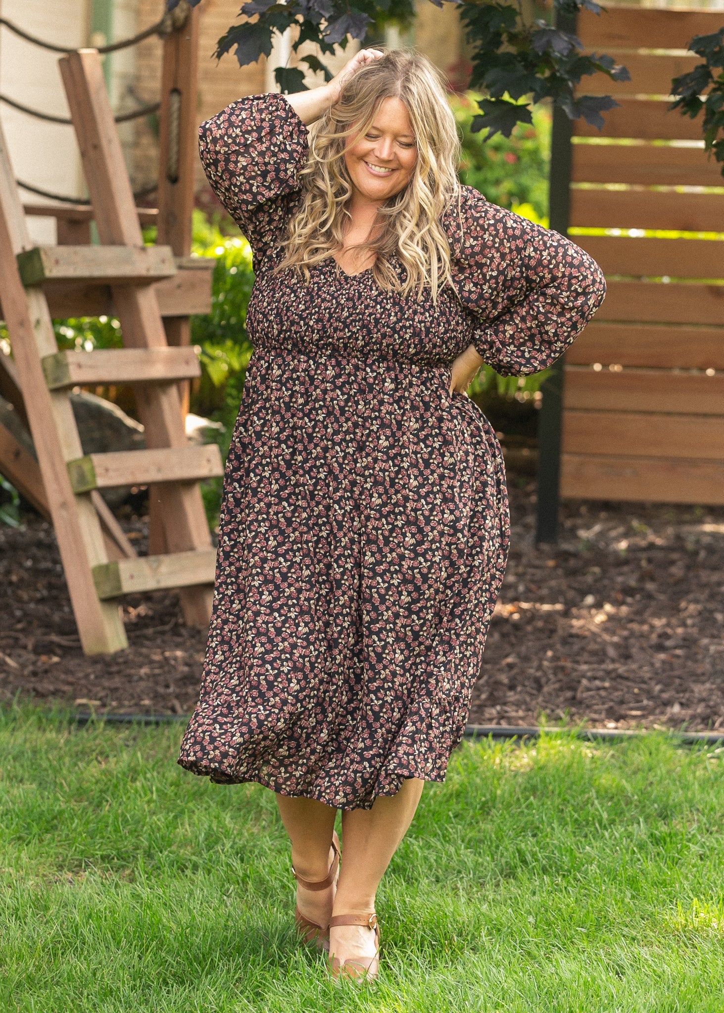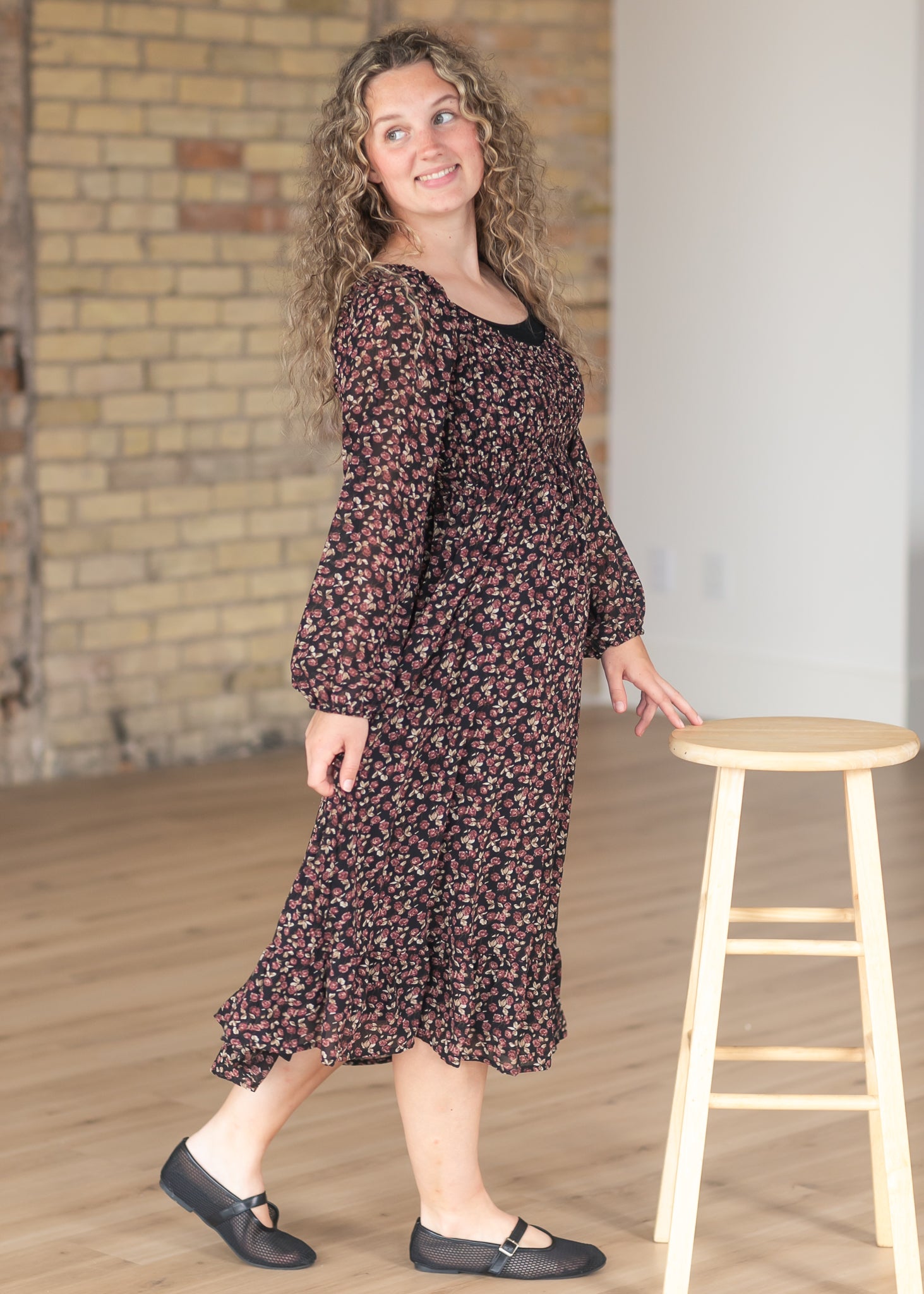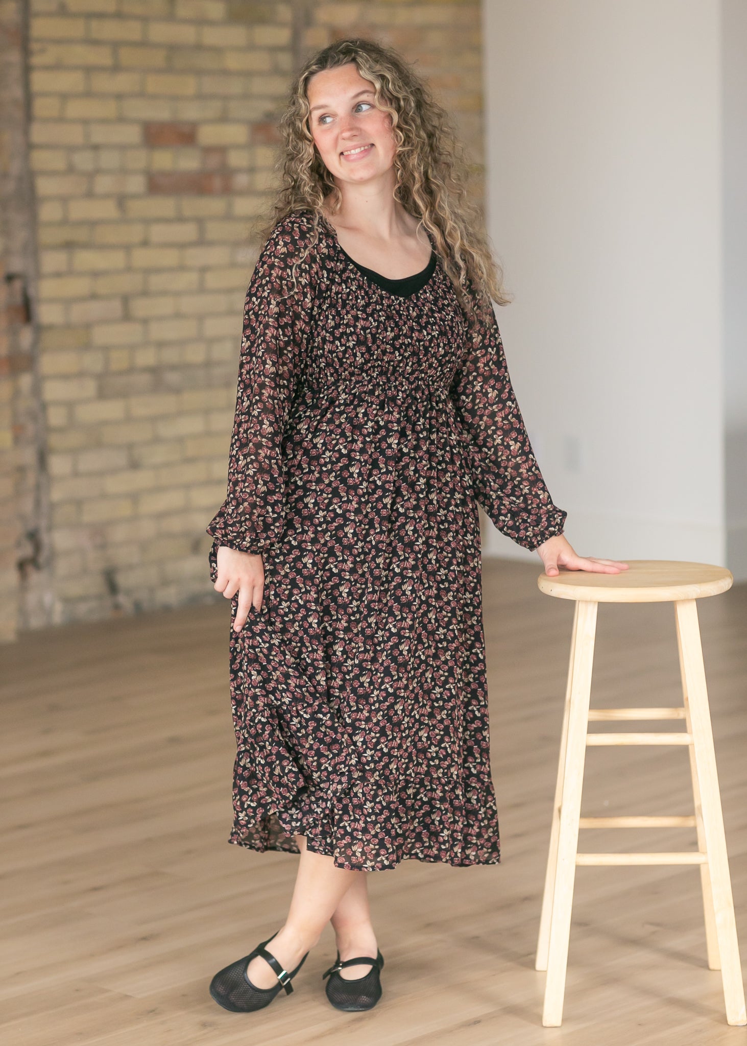 The Greer Long Sleeve Dress carries a graceful flow with its vintage-inspired floral print set against a dark backdrop, creating a look both timeless and feminine. The smocked bodice and airy sleeves offer comfort and ease, perfect for days spent wandering through bookstores or gathering with friends. Pair it with boots or flats for a modest, effortless style that lingers through every season.