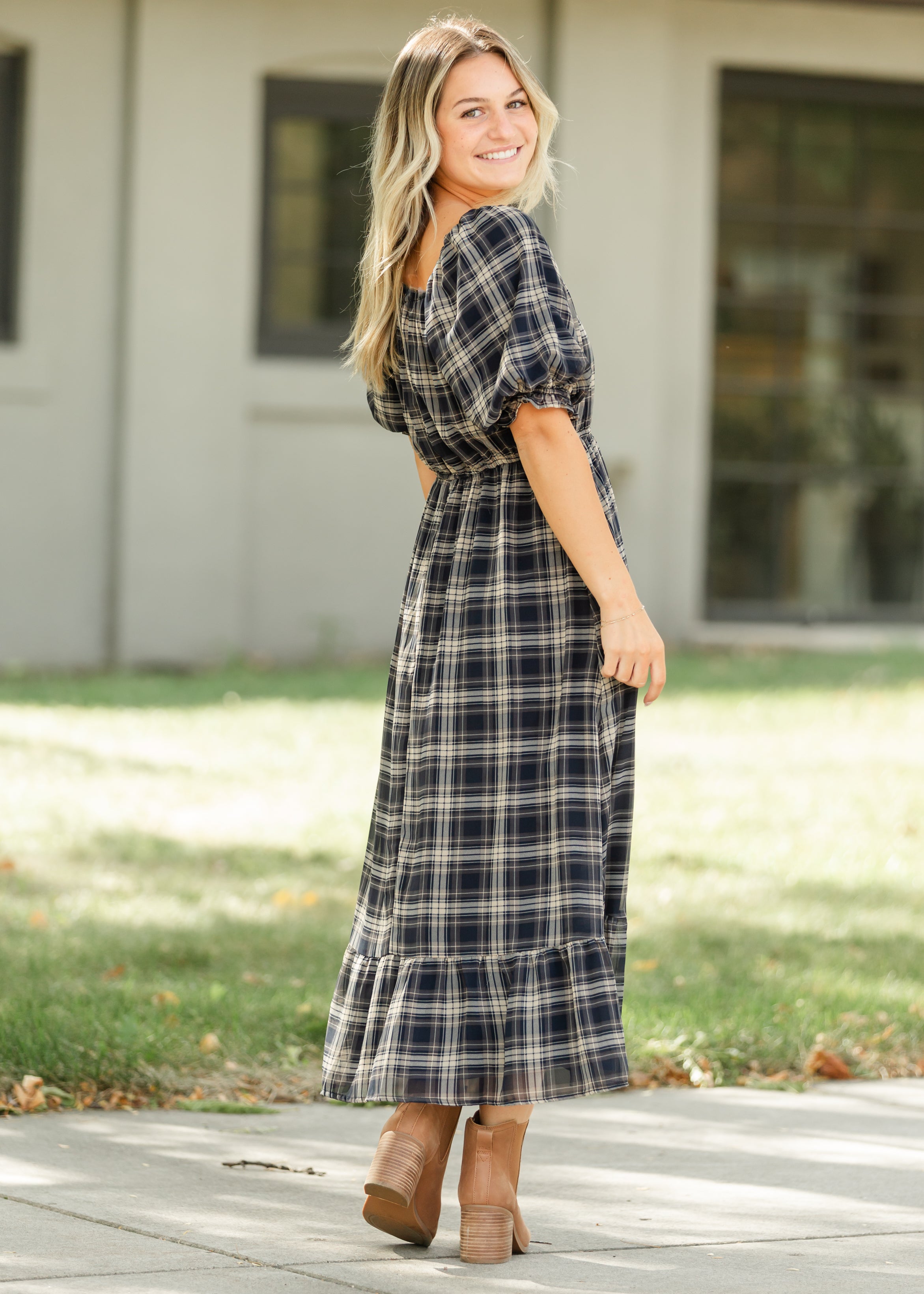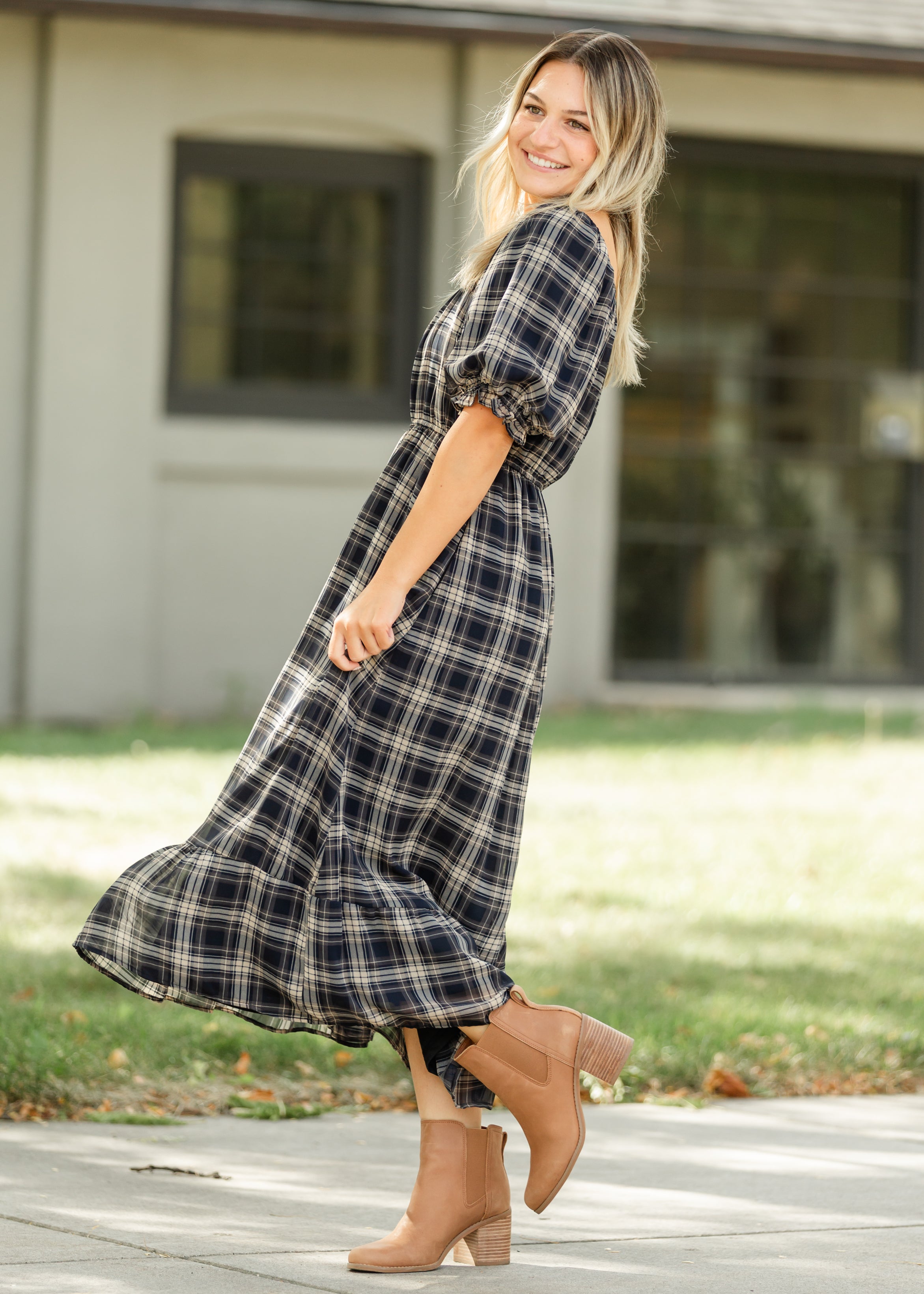 The Twila Plaid Maxi Dress brings effortless grace to your everyday moments. Designed with a classic navy and taupe plaid, this modest dress features soft puff sleeves, a gathered waist, and a gentle tiered hem that flows beautifully with each step. Its lightweight fabric offers ease and comfort, perfect for pairing with ankle boots for fall gatherings or church mornings.