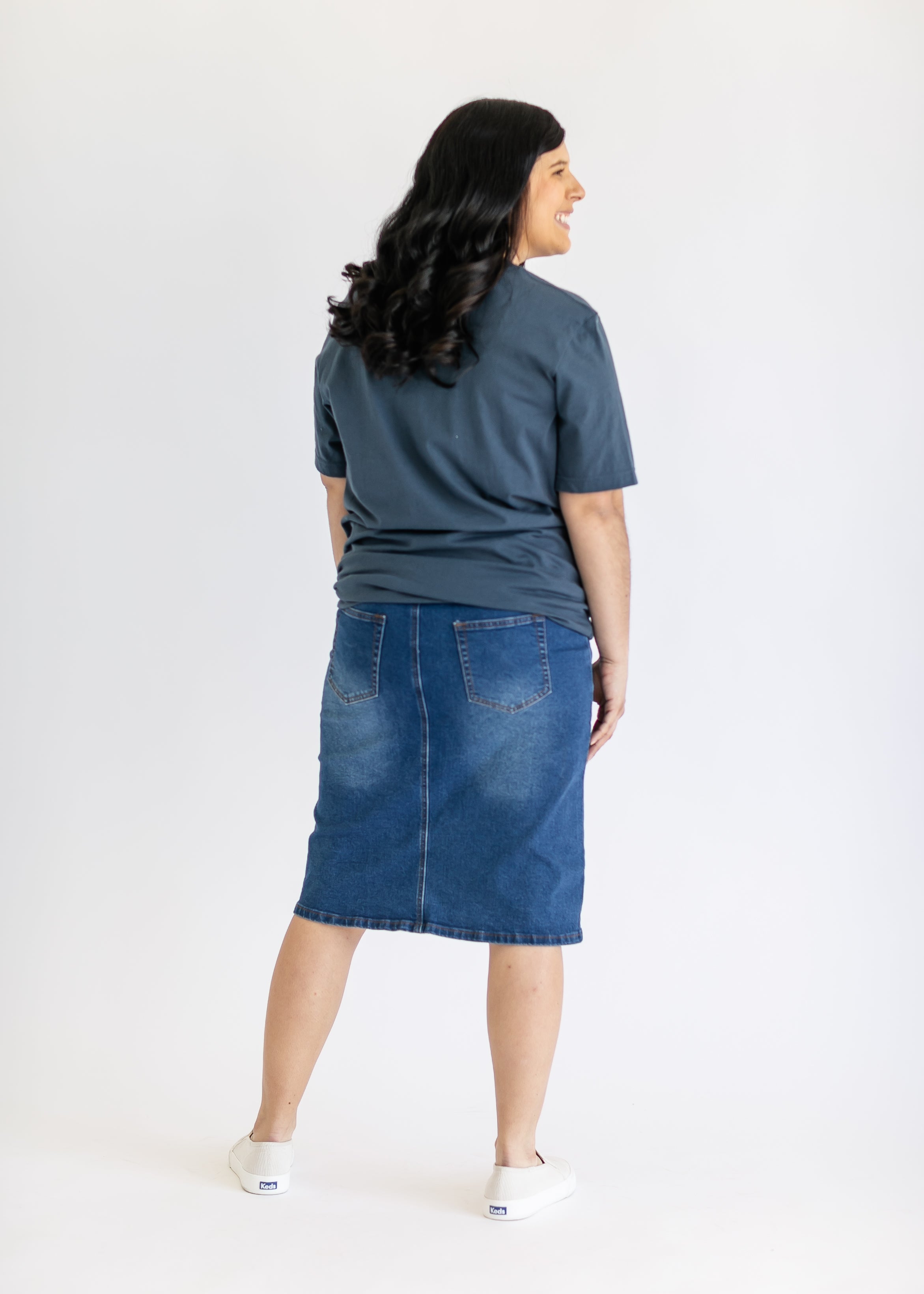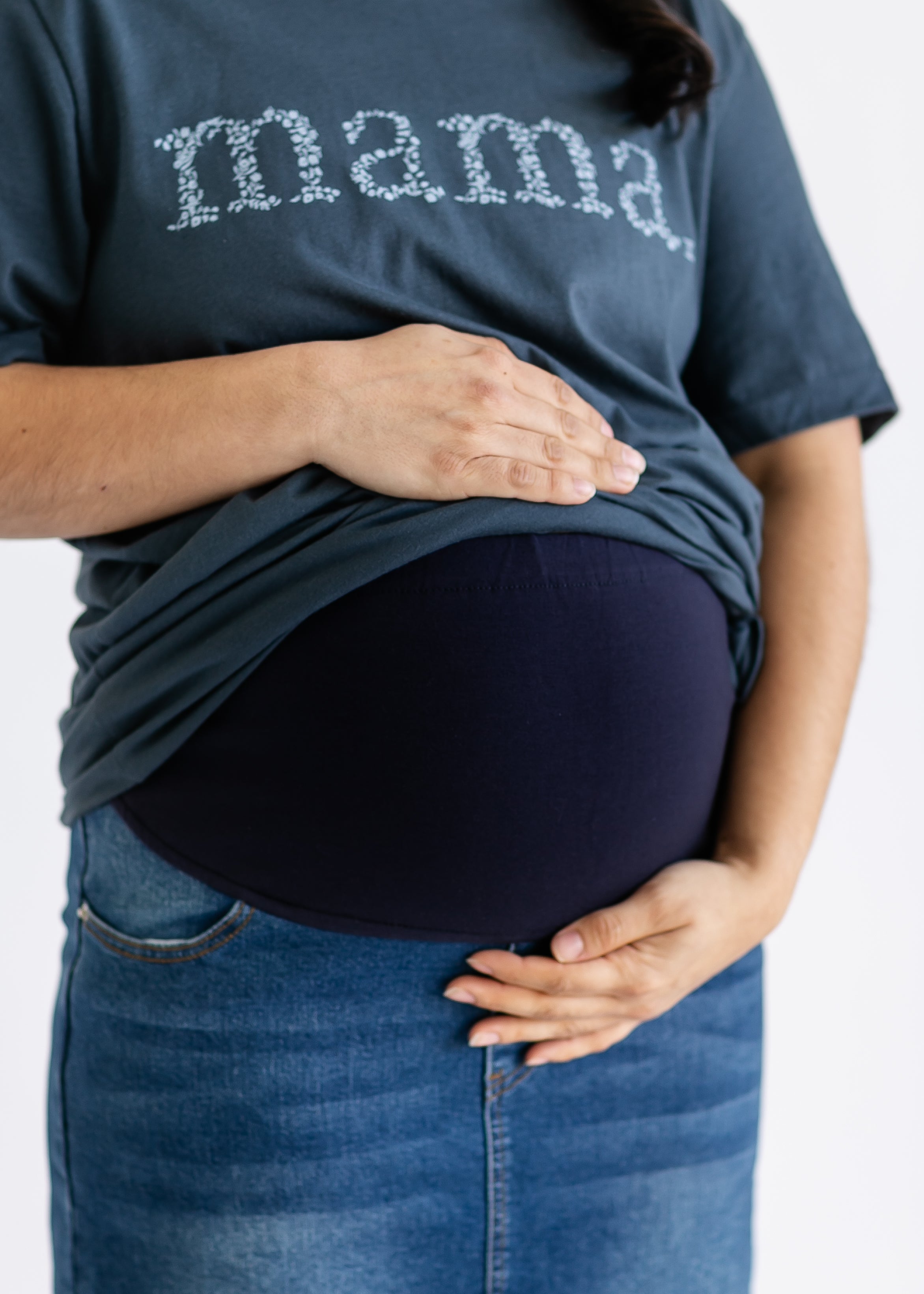 An Inherit Design, the Remi Maternity Denim Midi Skirt is cut with a modest and classic straight fit! This denim midi skirt will be ago-to time and time again for any occasion. With a wide belly band and a little bit of stretch in the back, you'll be able to wear this as your belly grows. This new and updated skirt adds a feminine style to your closet without any thought at being dressy or casual as it is definitely both! This skirt has awesome stretch for total comfort and no back slit while still allowing for unconstrained walking! This design cater to different heights, we are thrilled to offer BOTH 26" and 29" lengths to accommodate!