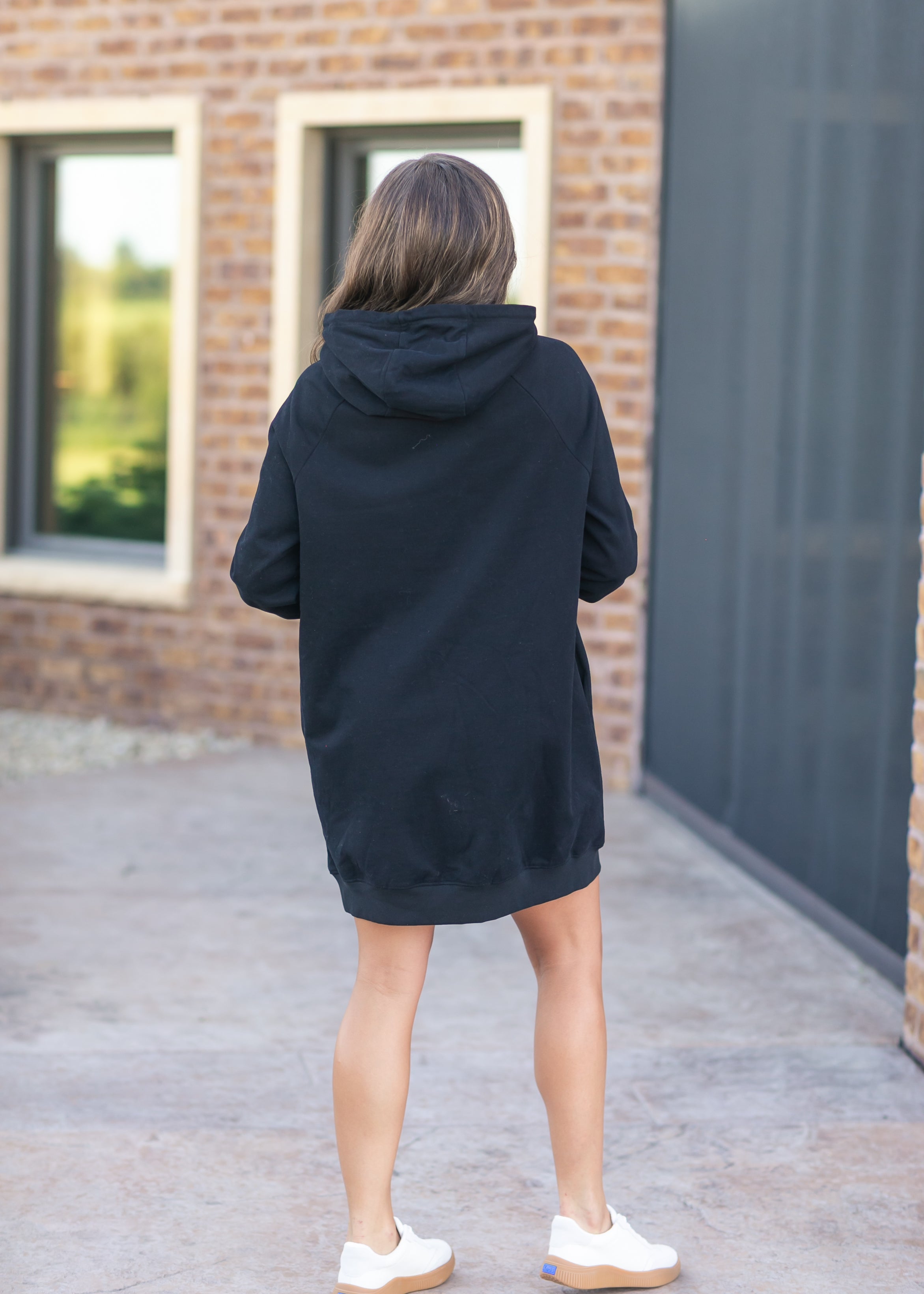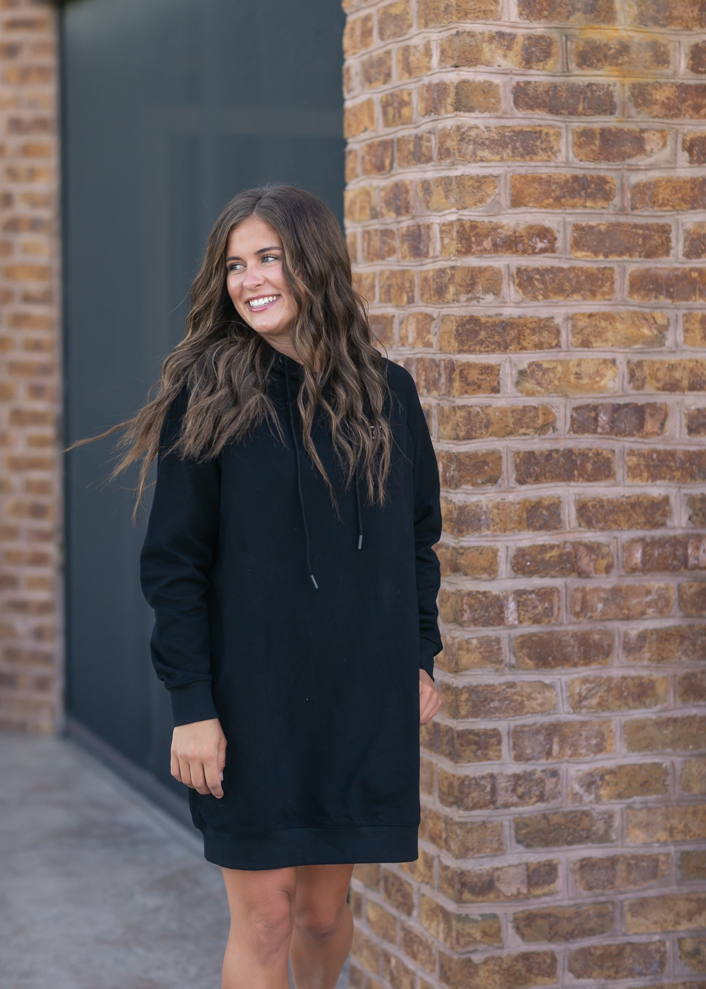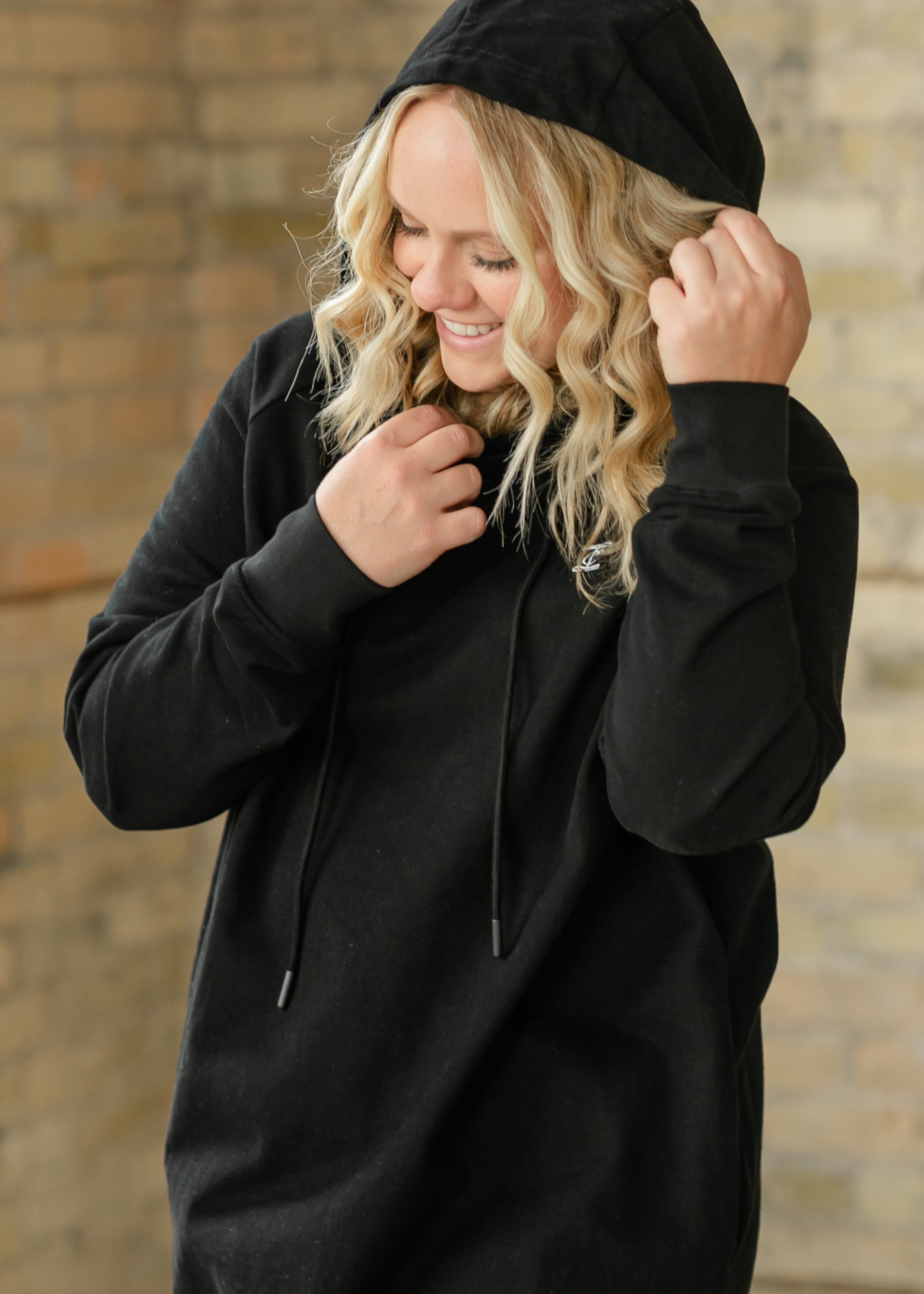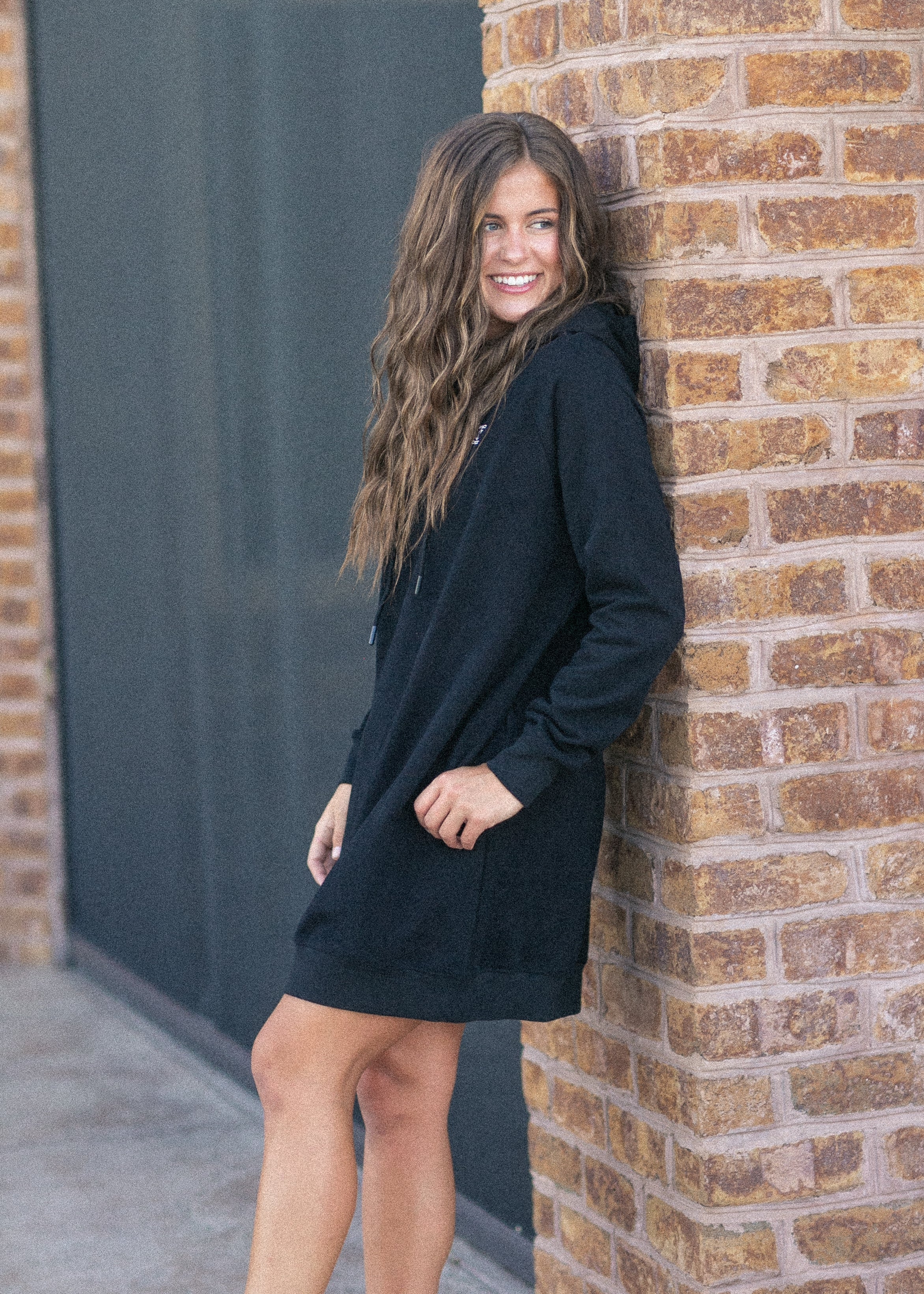 The Scout Midi Hooded Long Sleeve Sweatshirt Dress brings cozy comfort with a sporty twist. Crafted from soft olive fleece, this modest dress features a relaxed silhouette, practical side pockets, and a drawstring hood for laid-back days. Its ribbed cuffs and hem keep it effortlessly polished, making it an easy favorite for errands, travel, and everyday wear.