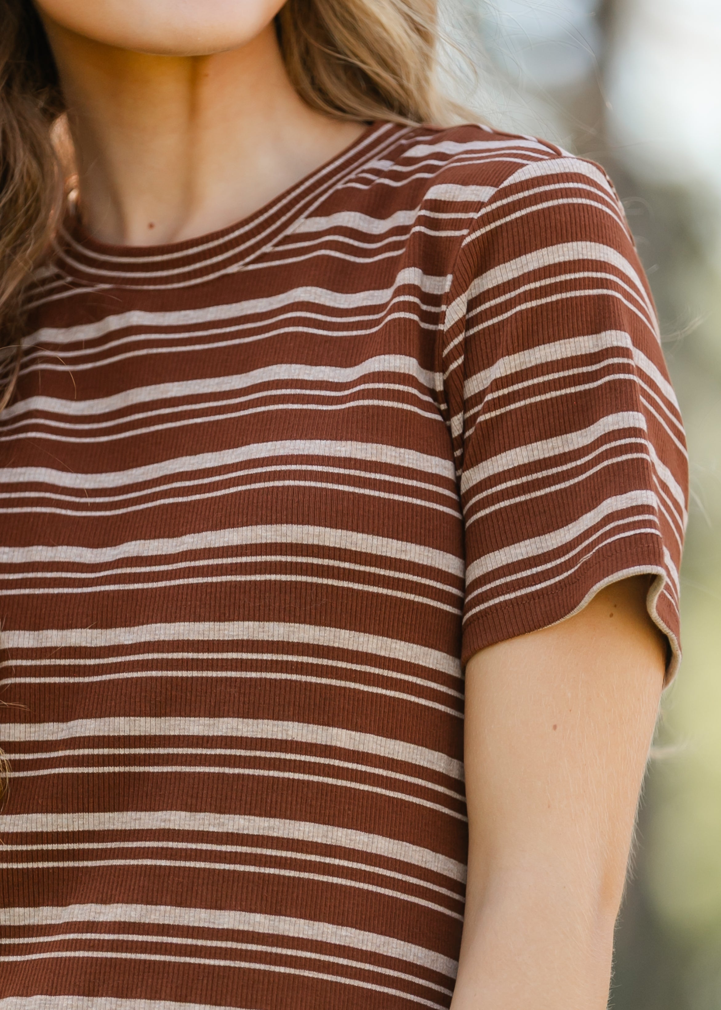 The Short Sleeve Striped Knit Dress features a soft ribbed knit with earthy brown and cream stripes that give effortless texture and movement. Designed with a crew neckline, short sleeves, and a flowy midi length, it offers breathable comfort with a flattering drape. Pair it with sandals in warm weather or layer under a cardigan for year-round wear.