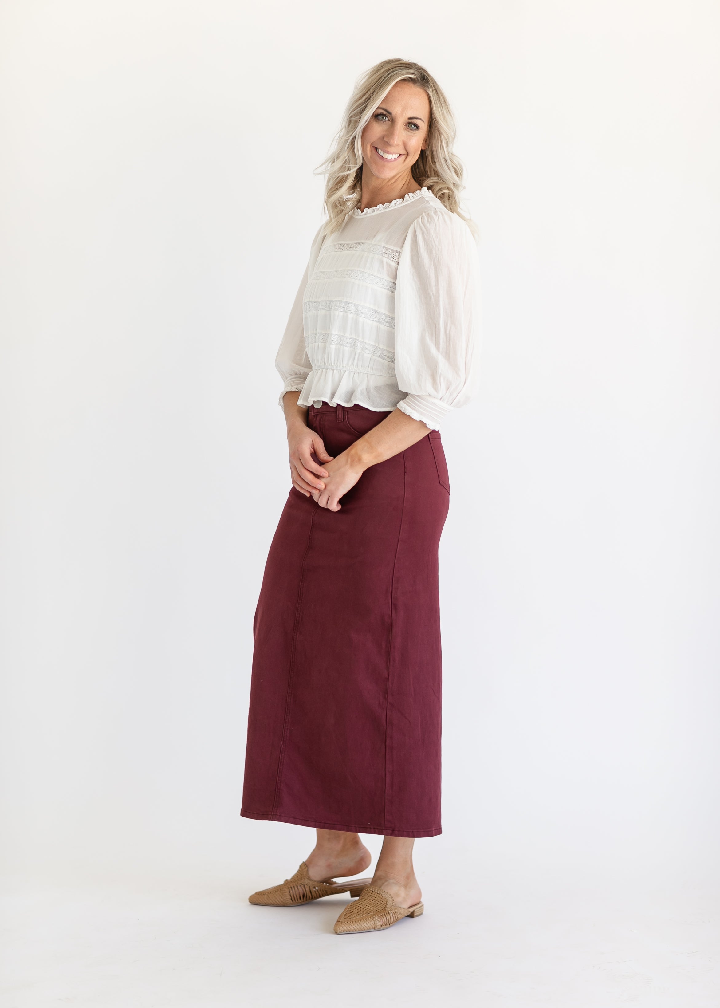 An Inherit Design, the Stella Burgundy Denim Maxi Skirt is a customer favorite we know you'll love. Now available in this beautiful warm mauve hue, this skirt is a wardrobe staple and one of our best sellers! The long denim is accented by a silver button with the Inherit Badge Logo and is tailored in a straight fit. There is a 14" back slit to make walking a breeze! No details were missed with this skirt!