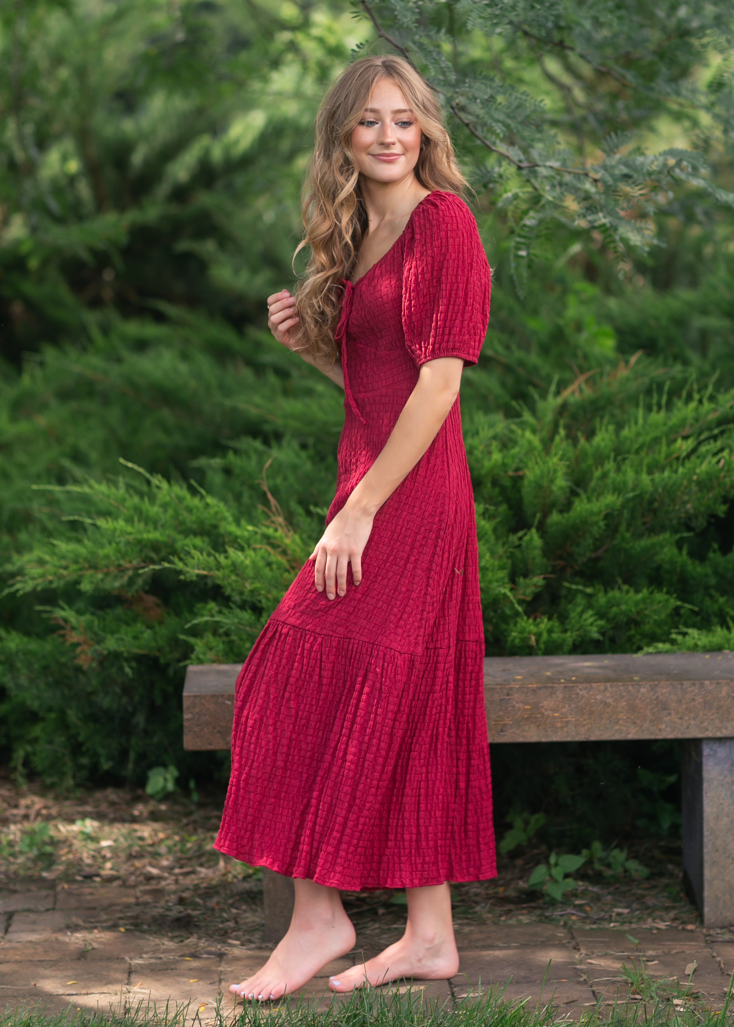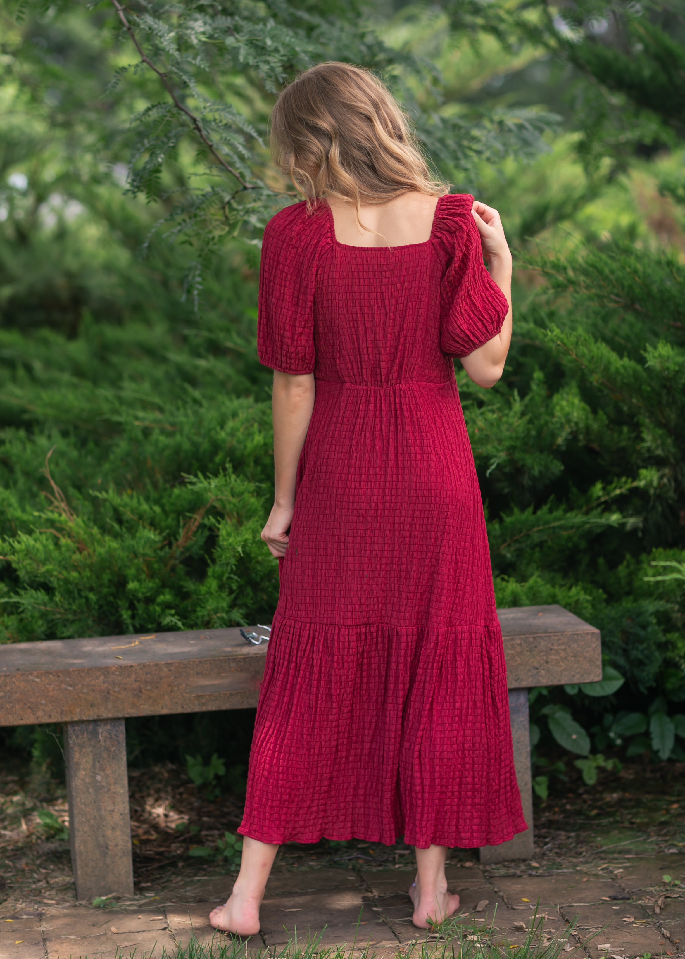 This Textured Woven Midi Dress brings vintage romance to life with its feminine tie-front detail, gathered puff sleeves, and tiered hemline. The rich berry hue and softly crinkled fabric create dimension while offering a graceful silhouette that flatters without clinging. Lightweight and breathable, this modest dress is ideal for fall events, Sunday service, or everyday elegance.